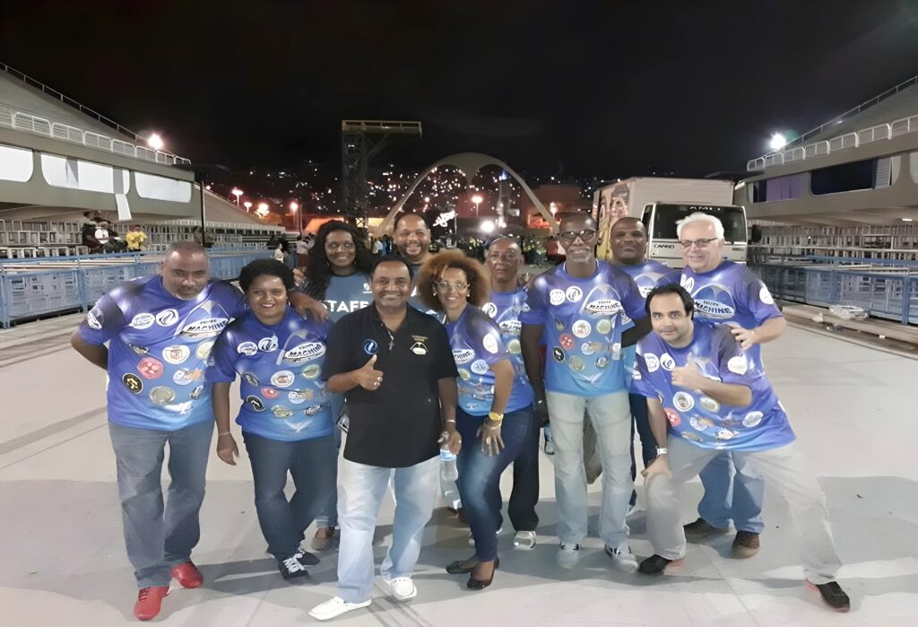Braço direito do Diretor de carnaval da Liga Independente das Escolas de Samba do Rio de Janeiro (LIESA), Elmo José dos Santos, Machine está no posto há mais de 25 anos – primeiro como funcionário da RIOTUR, e só depois da LIESA. Ele conta que é tão apaixonado pelo carnaval que se muda, literalmente da palavra, para o Sambódromo e convoca a equipe – composta por90 pessoas que trabalham nos Ensaios Técnicos e 21 pessoas que trabalham no Carnaval – no mês de novembro para dar início ao acompanhamento dos trabalhos de montagem das estruturas provisórias, camarotes, praças de alimentação, sala de imprensa e cabines de rádio, além da instalação de fornecimento de energia e água, e só sai em maio do ano seguinte, quando ele dar por encerrado a desmontagem da estrutura do Carnaval e entrega a chave à Riotur, para a realização do próximo evento. Na foto da esquerda para a direita: Anísio, Machine e Elmo